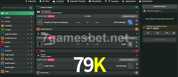 O 79K oferece uma grande seleção de opções de apostas em e-sports com probabilidades competitivas